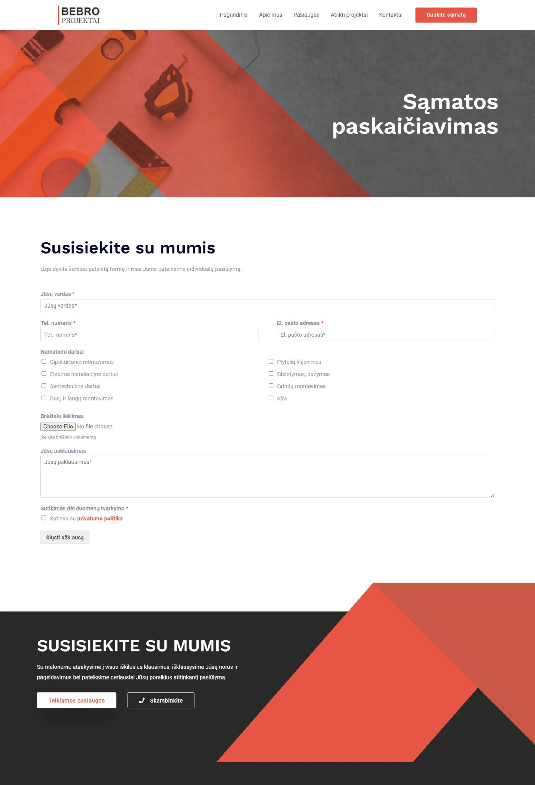 Svetainėje integruotas interaktyvus sąmatos skaičiavimo puslapis leidžia klientams pateikti išsamią informaciją apie būsimą projektą, įkelti brėžinius ar nuotraukas ir taip užtikrinti tikslesnį sąmatos apskaičiavimą net neatvykus į vietą. Toks sprendimas ne tik taupo laiką, bet ir suteikia daugiau aiškumo bei patogumo tiek klientui, tiek paslaugos teikėjui.