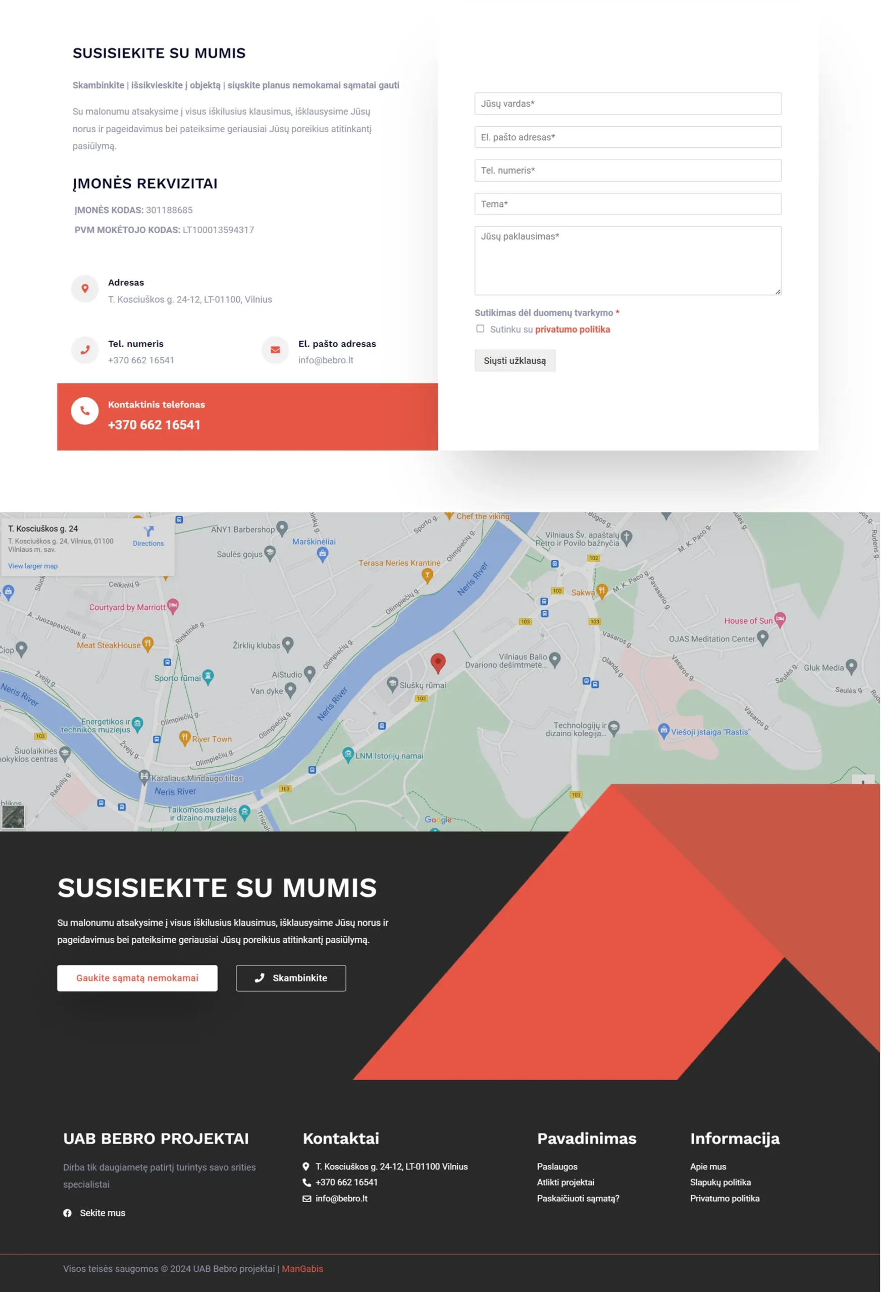 Be to, sukurtas funkcionalus kontaktų puslapis, kuriame kontaktinė informacija suskirstyta į patogias sekcijas, integruotos interaktyvios nuorodos, užklausos forma bei žemėlapis, leidžiantis greitai rasti įmonę ir užmegzti ryšį.