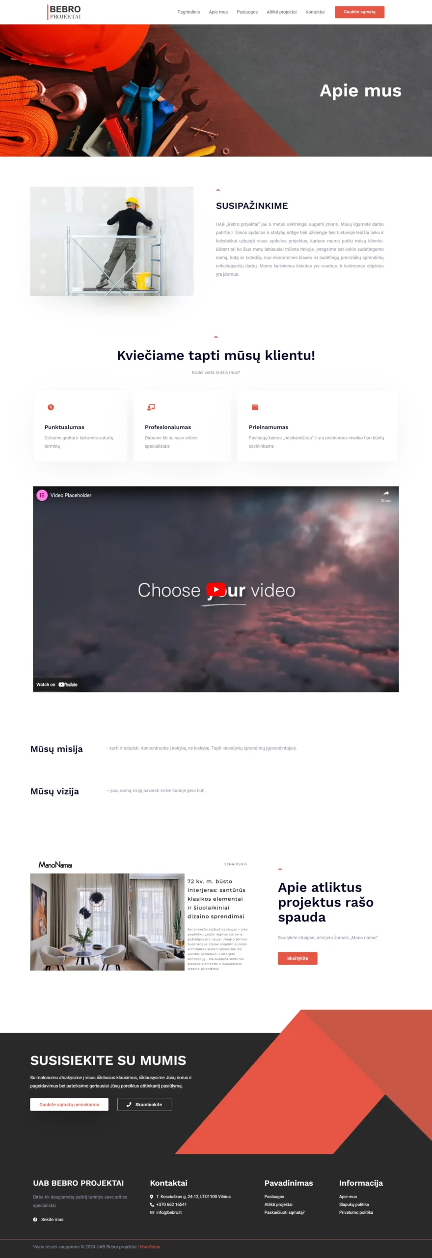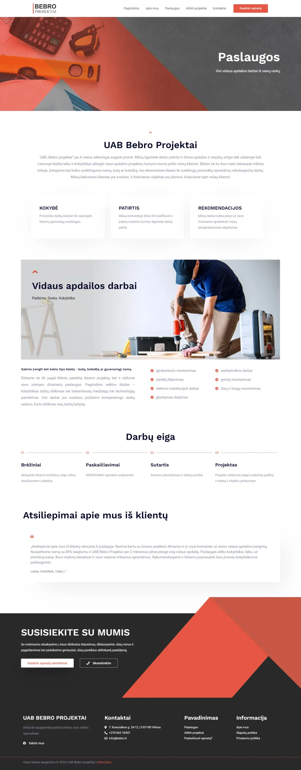Moderni vidutinės apimties reprezentacinė svetainė, pristatanti profesionalias interjero apdailos darbų paslaugas. Griežto stiliaus dizainas su raudonos, baltos ir tamsiai pilkos spalvų deriniu kuria solidų ir patikimą įvaizdį. Svetainėje lankytojai gali peržiūrėti atliktų darbų galeriją su aprašymais, susipažinti su teikiamomis paslaugomis, peržiūrėti integruotą vaizdo turinį bei patogiai naudotis interaktyvia kontaktų ir užklausos forma. Aiški navigacija, interaktyvūs susisiekimo mygtukai, integruotas žemėlapis bei greitas puslapio užkrovimas užtikrina patogią vartotojo patirtį.