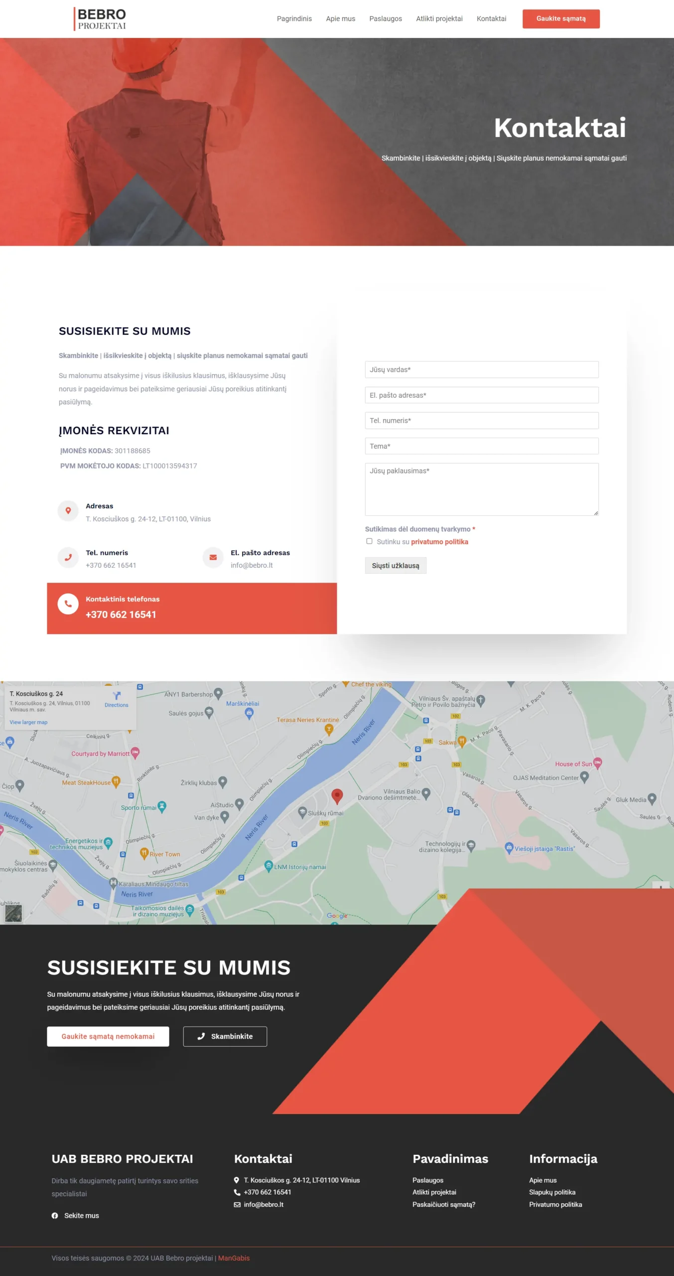 Be to, sukurtas funkcionalus kontaktų puslapis, kuriame kontaktinė informacija suskirstyta į patogias sekcijas, integruotos interaktyvios nuorodos, užklausos forma bei žemėlapis, leidžiantis greitai rasti įmonę ir užmegzti ryšį.