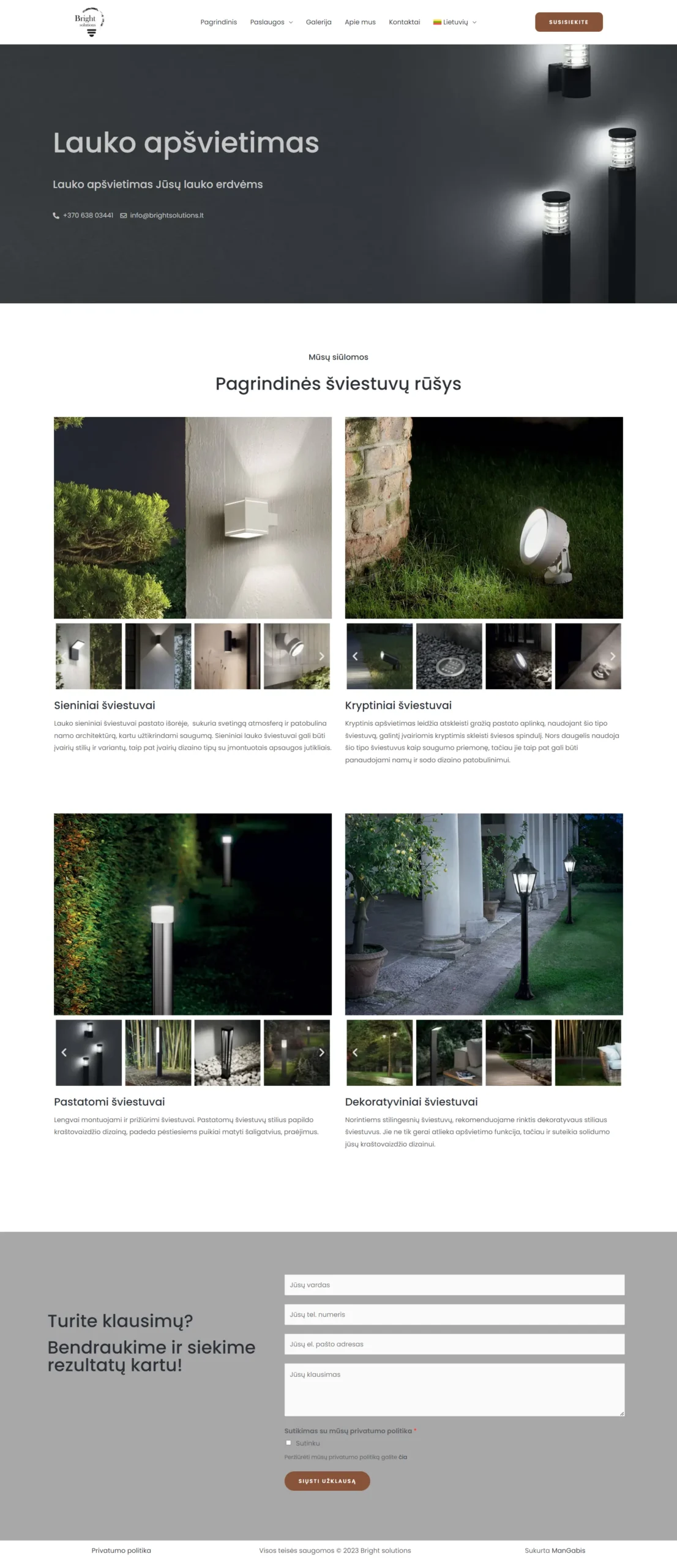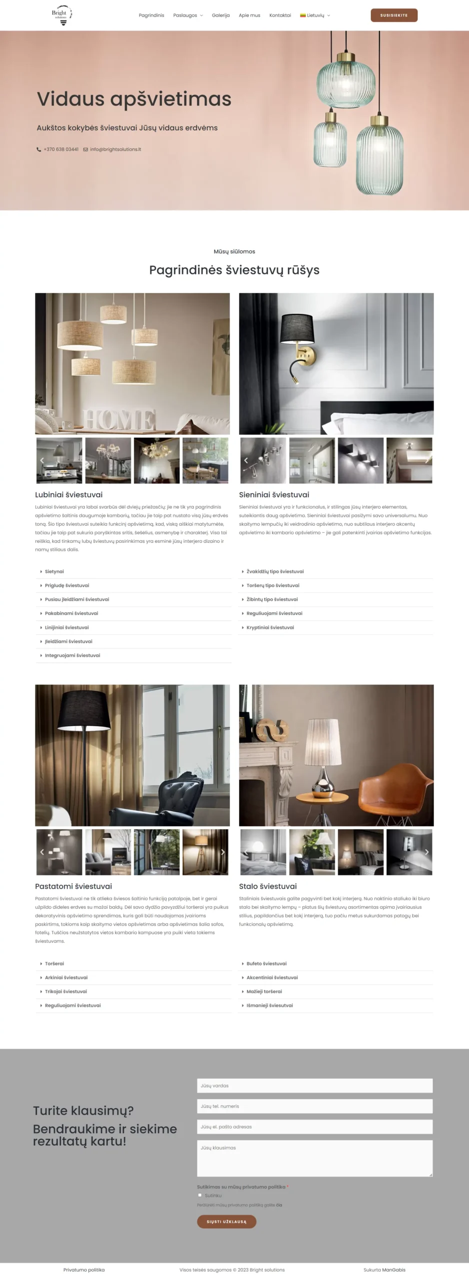 Svetainė sukurta tam, kad aiškiai ir patogiai atskleistų įmonės siūlomus profesionalius apšvietimo sprendimus bei plačią šviestuvų įvairovę. Minimalistinis dizainas su šviesiai pilkais tonais ir rudais akcentais suteikia modernumo bei solidumo. Puslapiuose naudojamos didelės foninės nuotraukos, fiksuotos pozicijoje, ir interaktyvios galerijos užtikrina vizualinį patrauklumą. Informacija pateikta aiškiomis sekcijomis, o papildoma informacija atsiskleidžia paspaudus mygtukus – tai palengvina vartotojo patirtį. Dviejų kalbų palaikymas leidžia pasiekti tiek lietuviškai, tiek angliškai kalbančius lankytojus.