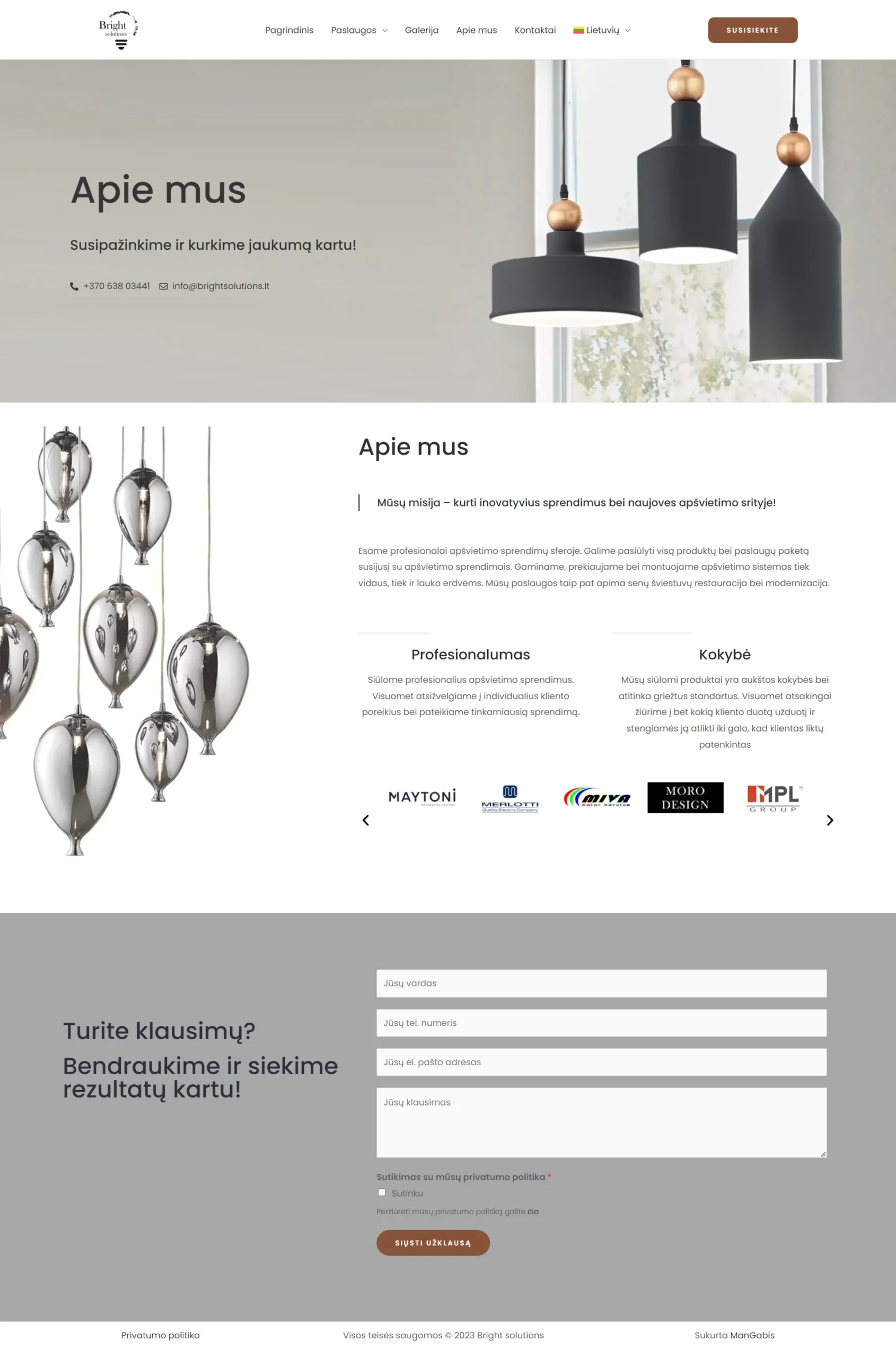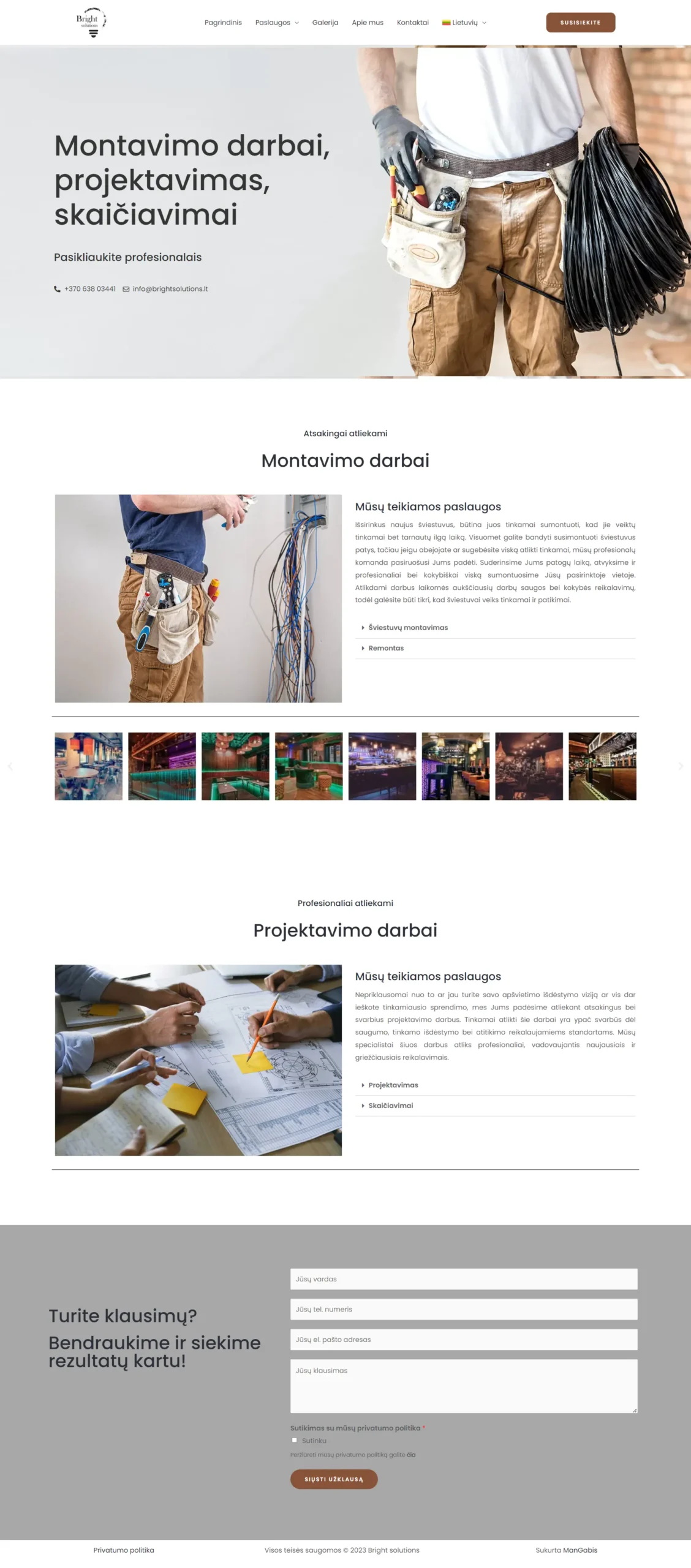 Moderni reprezentacinė svetainė, kurioje aiškiai ir patraukliai pristatomi įvairūs apšvietimo sprendimai bei montavimo galimybės. Informacija pateikta sekcijomis, naudojamos slide galerijos leidžiančių lankytojams greitai susipažinti su darbų pavyzdžiais. Integruotos interaktyvios užklausos, kurios suteikia galimybę klientams lengvai susisiekti arba pateikti užklausą dėl paslaugų, o vientisas dizainas su šviesiai pilkais tonais ir rudais akcentais užtikrina profesionalų ir estetišką įspūdį.
