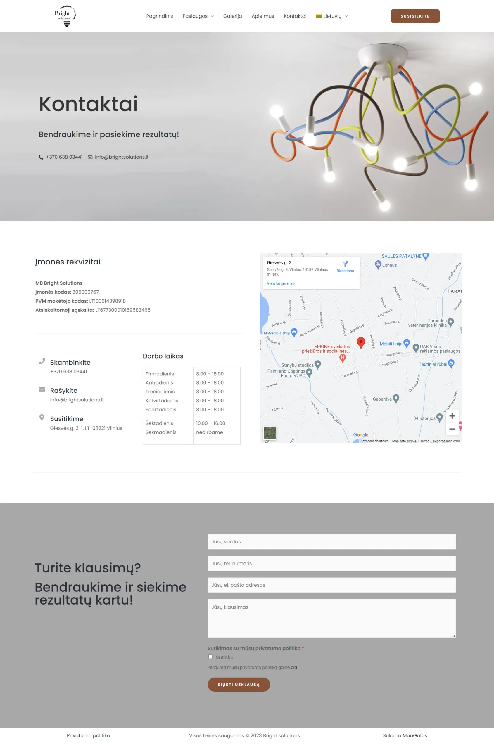 Kontaktų puslapyje integruotos interaktyvios susisiekimo nuorodos, pateikti rekvizitai, darbo laikas, žemėlapis ir kontaktų forma, užtikrinantys patogų ir greitą bendravimą su klientais. Vientisas dizainas, aiški struktūra ir interaktyvios funkcijos padeda lankytojams lengvai susipažinti su įmonės veikla bei paslaugomis.