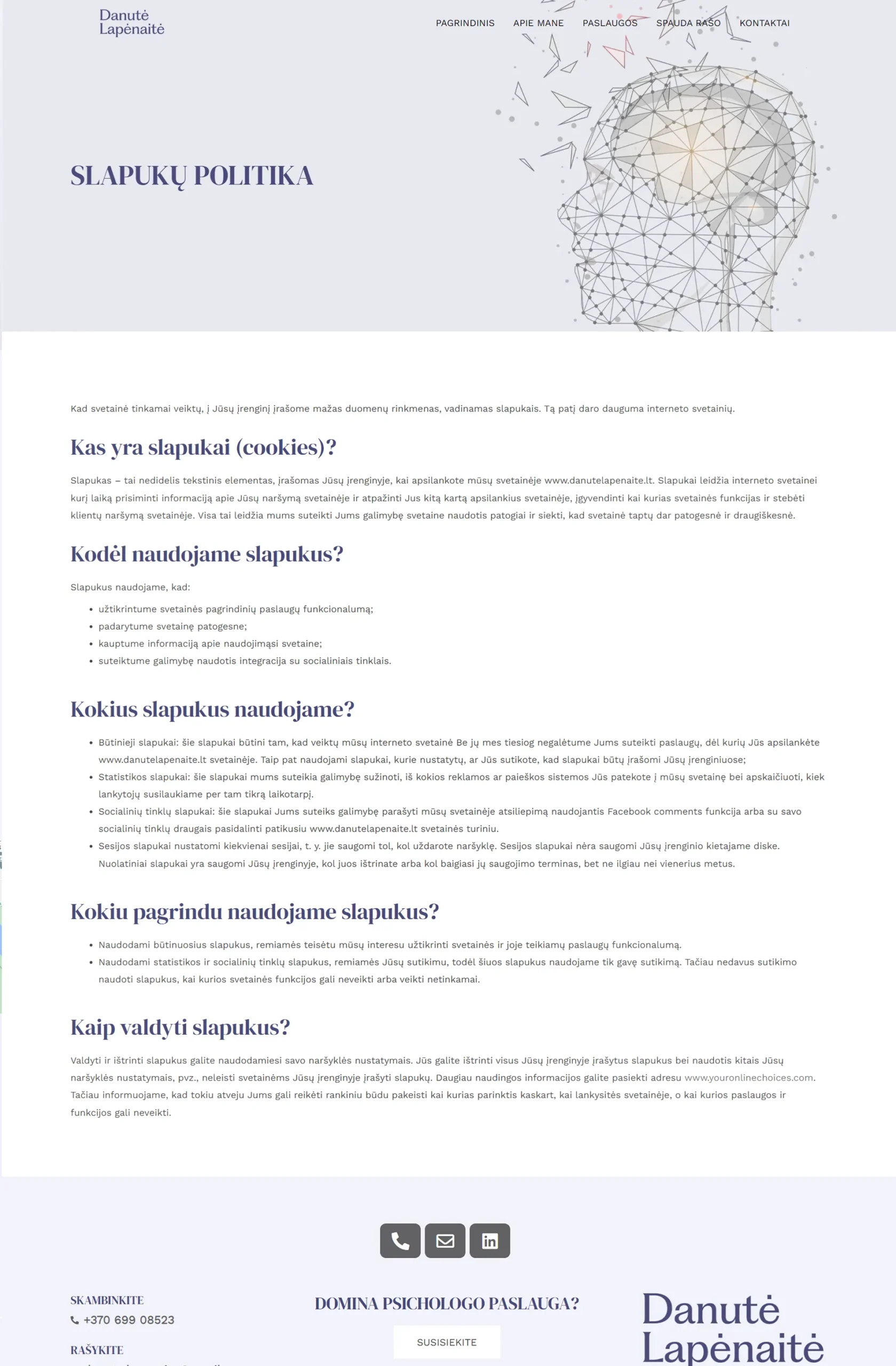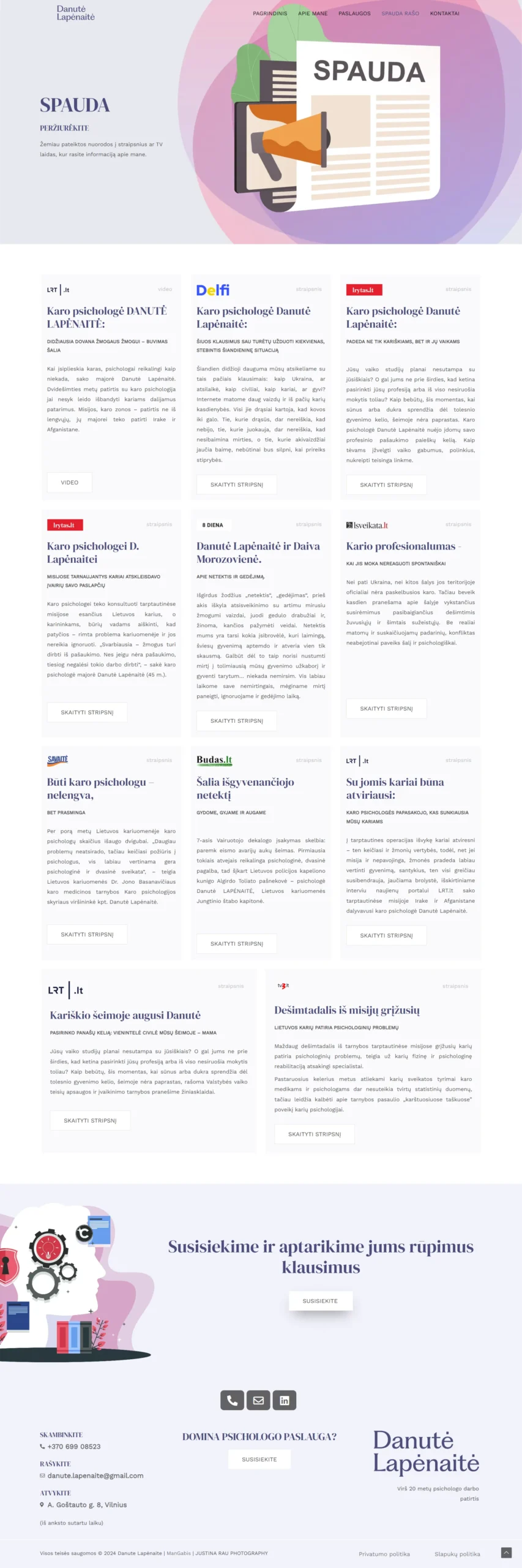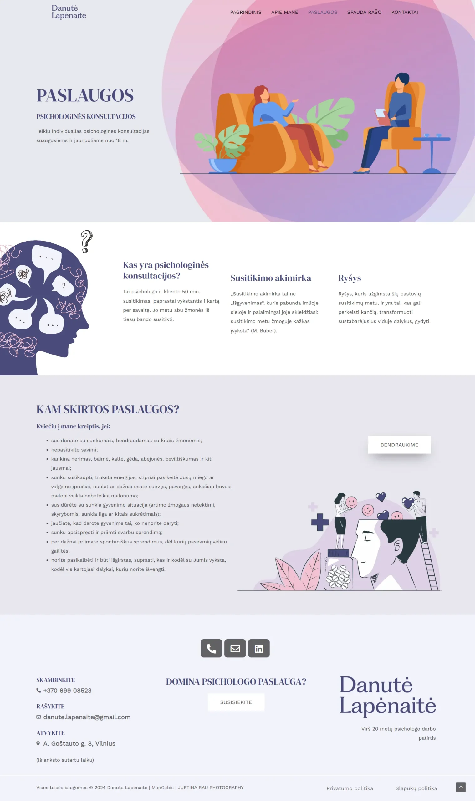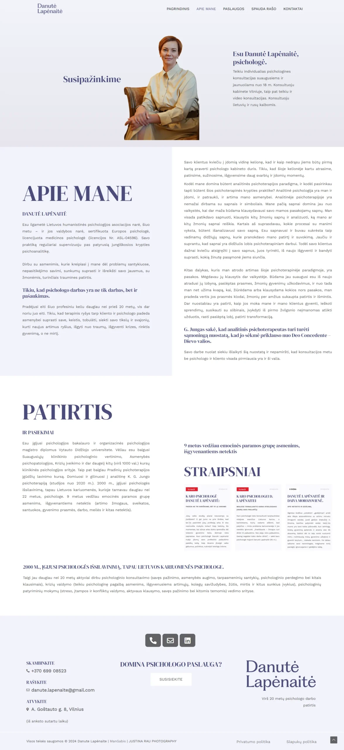 Reprezentacinė svetainė pristato Danutės Lapėnaitės individulią veiklą – psichologinės konsultacijas. Puslapyje „Apie mane“ lankytojai supažindinami su jos patirtimi, darbo metodais bei požiūriu į konsultacijas. Paslaugų skiltyje aiškiai pateikiama, kam skirta kiekviena paslauga ir kokie naudojami metodai, informacija suskirstyta sekcijomis bei popunkčiais patogiam skaitymui. Skiltyje „Ka rašo spauda“ integruoti straipsniai su interaktyviomis nuorodomis, leidžiančiomis perskaityti juos pilnai, o papildomi iliustraciniai elementai suteikia svetainės turiniui vizualumo ir profesionalumo.