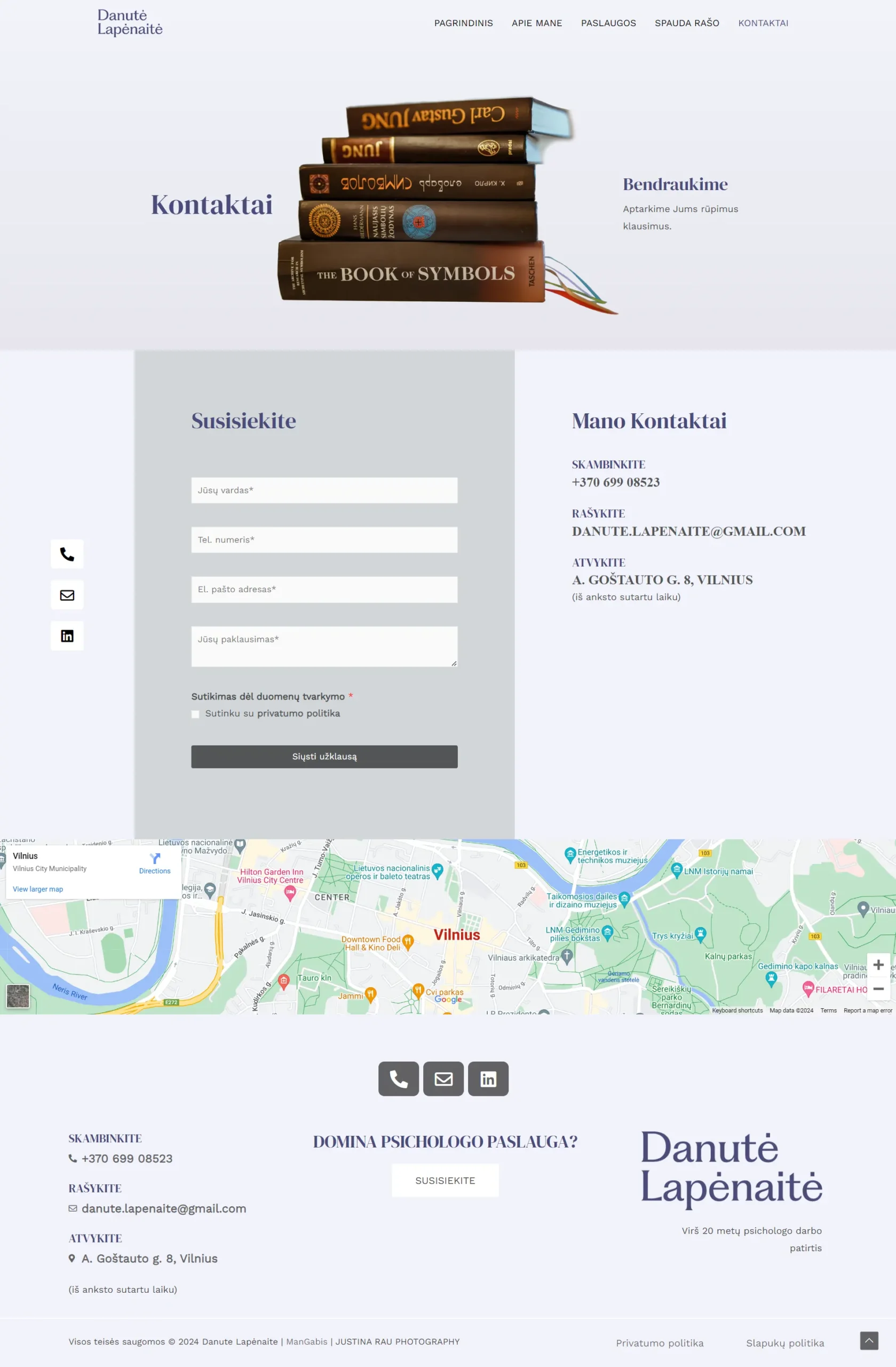 Kontaktų puslapis yra maksimaliai patogus lankytojams. Integruoti interaktyvūs susisiekimo mygtukai leidžia lengvai paskambinti arba parašyti žinutę, o interaktyvi kontaktų forma suteikia galimybę tiesiogiai pateikti klausimus ar užklausas.